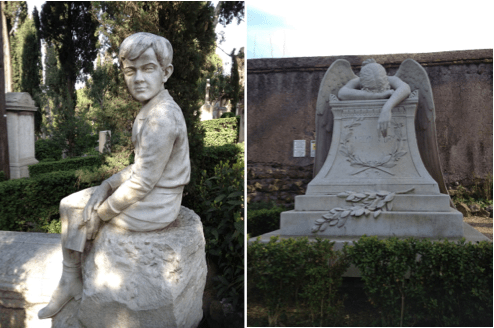 Naast de graven van Keats en Shelley vind je op het Campo Cestio, sowieso een heerlijke en prachtige oase van rust in Rome, verschillende grafstenen die meer op kleine kunstwerken lijken dan op zerken. De sculpturen zijn zo nu en dan ontroerend, de bijbehorende teksten intiem. Wandelen over de niet-katholieke begraafplaats van Rome is een bijzondere ervaring.